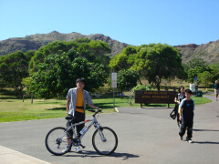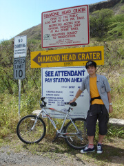 | レンタサイクルでダイアモンドヘッド来ました | 頂上からの風景は美しい | 下山後に自転車と一緒のもう一度写真 |