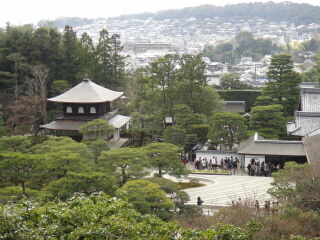 食後は地下鉄で東山へ。銀閣寺へ向かうためにバス待ちです。 バスがなかなか来ません。しかも来たバスは満席。 フリーパスの意味がないじゃん。 しかたないので歩いて違うバス停まで歩きます。 方向を間違えてしまったのですが、インクラインという昔、 電車が走っていたレールがある丘の上に桜が満開です。 的屋のたこ焼きとビールでしばし花見です。 再び歩いて平安神宮のバス亭から銀閣寺へ向かいます。 銀閣寺道で降りて、哲学の道の桜を楽します。 満開でとっても綺麗です。前回の銀閣寺は修復中でしたが、 修復が終わって、とってもしぶい銀閣寺が見られました。 ここは桜というより、苔が綺麗なお寺です。 |