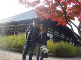 阿修羅像は諦めて東大寺へ。途中、鹿がいっぱいです。 鹿せんべいを購入します。鹿と紅葉が綺麗です。 出店があるので、ジャンボフランクを食べます。 東大寺といえば奈良の大仏。でかいです。 人もいっぱいです。 | |