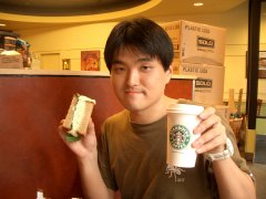 ツアーに かけるわけですから、かなりの期待度です。朝8時にDAYS HOTELに集合ということなので、 かなり、 朝は早く起きるのでした。心配の時差ぼけはほとんど無く、3人とも問題無く朝をスタートする ことができました。ホテルに軽い朝食が用意されていることを知ったのは、帰りの日でした。 そんな朝食があるなどつゆ知らず、僕らはDAYS HOTELのスターバックスでお食事をするのでした。 あとから(帰国してから)、聞いた話ですがここのスターバックスに参加者がいたそうです。 まったく気づかず、がっついてサンドイッチを食べてました。 |