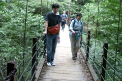| ケーブルカーで行くとあっちゅーま。 いつもの山岳会では重装備で行く 高尾山ですが、ハイヒールでも 行ける山なのですよ。 天気は良好。 伊原くんもスタスタ登って行きます。 つり橋もスタスタ渡って行きます。 |