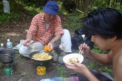 今日の料理はお好み焼き。チジムの失敗を 教訓に火力の強いバーナーを利用。 大成功!!玉子スープも美味い。5つ星。 ここで、 登山家のお兄さんに出会いました。 「ダックスフンド大好き!」 で、タイトルですが、しげが猿に襲われ、 猿がでっかい岩を投げてきました。 あと、翌日ミシシッピーが控えてる 宮内くんですが、山ではあんなに蜂が いても、全然刺されなかったのに、 温泉のいっぴきの蜂にさされました(爆) |