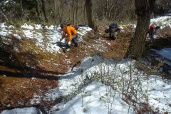 前日は桜が散る中、大雪で寒かった のですが、さすが山岳会晴天にみまわれ ています。でも道はドロドロ、雪雪。 すべりまくりで、雪解け水にカバンは 濡れ濡れ。滑ってころんで一本!