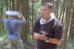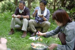 プ、プロデューサー、標高見えませんよ... あ、タイトルですか?これはプロデューサーが、 剣道の竹刀を振るときのかけ声です(ウソ)。 で、問題なのはお昼御飯を作った後です。 雷雨です。びしょ濡れ。坂本さんは傘(\100)を 出していましたが(-_☆ 他のみんなはビショビショです。 でも、会長のイリュージョン開始(下図)。 |