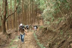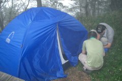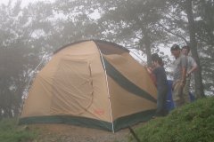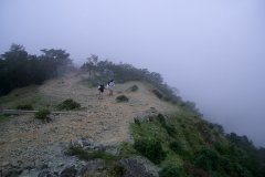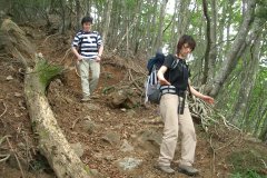 いよいよ下りです。なんと宮ヶ瀬まで11km。 中川さんはずっと下りだと思い込んでおり ますが、恐ろしいアップダウンがあります。 「みやうちく〜ん、聞いてないよっ!」 しっかしマジ辛いです。雨降るし足場悪いし。 途中、熊の糞らしきものがあり、ちょい恐怖。 それより恐怖は前回も登場したヒルズです。 田村嬢またもや吸われてます。 みずほさんが谷底へ落ちかけた以外は、 何事も無く無事にテント泊終了〜。お疲れ様! |