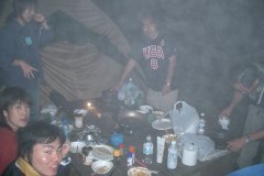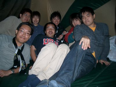 | 中川家の6人用テントの中で記念撮影: 七人入っても大丈V |