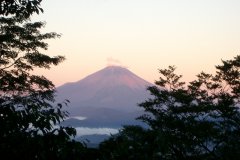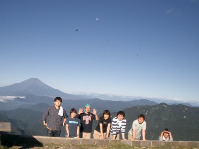 山頂の強風にテントが揺らされたり、 真夜中に餌をさぐりにきた鹿の鼻息や、 「山岳会の学級新聞を作ろう」という 隣のテントからのにぎやかな会話や、 トド肉を食べた鳴海さんの獣の様ないびきや、 がさごそがさごそと落ち着きのないスーさん に気を取られた体は完全に寝不足です。 それでも日本の夜明けはやってくるのです。 富士山と朝焼けが絵になって最高! | |