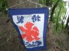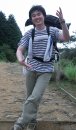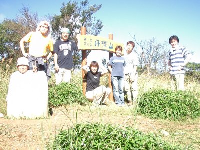 | 丹沢山の頂上で記念写真: 逆光気味で鳴海さんの石の字読めない |