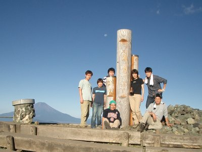| 塔ノ岳の標札の前の記念写真: まだ月が出てます |