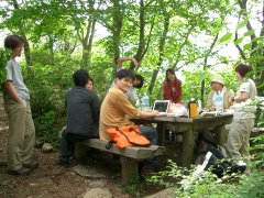 お天気はというと山岳日和。 バスの中で決めた仏果山の山頂に到着です。 山らしい山って感じの山でした。 山頂にある展望台には当然、高所恐怖症の しげは登れません。 てか、圏外なんでスーさん連絡つきません。 どないしよ。ヘリのチャーターが間に合わ なかったのでしょうか(笑)。 ヘリの免許持ってる人と自衛隊ならなんとか なるっしょ。てことで料理開始。 | |