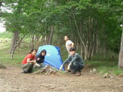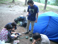 毎年恒例(にしたい)キャンプです。 今回のプロデューサーはハチに刺されて、 3つめのニップル作った鳴海さんです。 3グループに分かれて、下の3名と 宮内くんの4名が第一陣メンバーです。 ↓まいっちんぐ ↓ヤー!女性2名