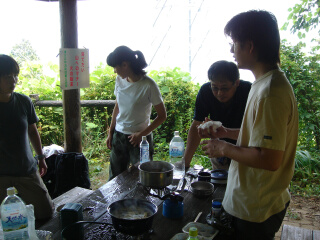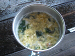 東屋に戻って昼食です。前回に続いてスープのみです。 中川さんが計量した水をわざとこぼして、水をたくさん もってきていることをアピールしたため、テーブルは、 びしょびしょになっております(笑)。 ↓たまごたっぷり海老(えび)烏賊(いか)海鮮スープ