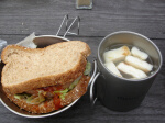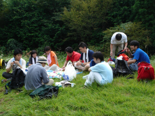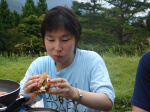 山頂なんだか山頂じゃないんだかわからない野原到着。 本日の料理はSPAMサンドイッチと笹かまスープ。 すーさんの18番料理ですね。 ベンチを制覇されてしまっているので、敷物しいてお料理。 岡本さんが活躍です。 ↓SPAMセットおまちー ↓けちゃっぷこぼしまくり