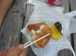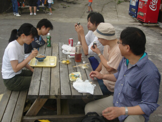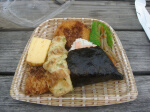 ロープウェイで女体山へ。ここでお弁当タイム。 筑波山は火気厳禁なので料理が作れません(涙)。 ここの食堂の「女体ラーメン」が非常にきになる。 どんな神秘的なラーメンなのでしょうか? てか、ウィンドーにはどう考えても普通のラーメン。 田中さんはここで女体持つ煮込み食べました ↓SHOP99持参品おにぎり ↓現地調達焼きおにぎり