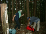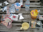 早くもお食事のお時間です。 各自持参のインスタント食品です。 「てっとり早いから」という理由でございます。 ここでのエピソード! 会長が、なんと!塩味だと思って買った カップヌードルがシーフード味でした! ちっこ。 ↓インスタントの山 ↓頂上からの下界
