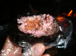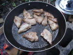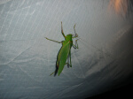 テントの中には不法侵入者が(写真)。 手でつかむのも嫌なので、そのまま寝ました。 朝、潰してないことを祈りつつ、5時過ぎに起床。 寝袋からは、昨年のタオルが出てきました...。 和氣ちゃんキャンプから洗ってないってことです。 朝食メニューはパン、ハム、ベーコン目玉焼き、スープ。 ↓夜の不法侵入者 ↓自然のキュー