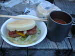 二日酔いが復帰して、元気なゆみちゃんと登山開始。 降水確率50%の平林くんの予報はハズレ(笑)。 あっと言う間の山頂ですが、滝を見に歩きまくりました。 お食事は鳴海さんリクエストのスパムサンドです。 突風でピクルス汁、ぶっかけられました(涙)。 ↓ランチョンミートです ↓スパムサンドは美味い