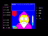入学して部活紹介を見た時から、コンピュータに興味があったので入会しまいた。1年生の頃は3年の先輩はいませんでした。2年の先輩に山本先輩、新谷先輩、今泉先輩、徳永先輩の4人がいたと記憶しています。まー、同好会ですから上下関係なんてものは、あまり存在せず楽しく過ごせました。同期は何人かいました。福間、石井、伊藤、保坂、横山、他。伊藤くんは身体に障害のある子でした。叫んだり、喚いたり、頭を叩いたりしていましたが、一緒に楽しい時間を過ごすことができました。同好会の活動内容なんてものはありませんでしたが、一応、文化祭に向けて出展ソフトを作るというものでした。当時、情報処理室にあったPCはPC9801VM1台、PC9801VX3台、PC9801DA1台でした。DAは先生のテスト問題作成PCなので触らせてもらえませんでした。開発は主にPC9801VXで行っていました。スペックはCPU286、メモリ:なし、HDD:なし、FDD:5inchという今では考えられない恐ろしいスペックです。それでも当時は買おうと思っても買えない超高性能PCなわけです。僕は毎年1本ゲームを作成しました。作成したといってもファミリーベーシックで馴らした、初歩的なBASIC(N88DISK-BASIC)を組み合わせて作ってる超しょぼいプログラムでしたが。1年目に作ったゲームは「QUEST」(図1参照)。これはDISC-BASIC特有の記号を組み合わせてキャラクターを作ったテキストアドベンチャーRPGゲームです。今で言うフェースマークのようなテキストキャラクターを沢山作りました。ボスキャラの「ハデス」なんて、めちゃくちゃこってて、凄かったですよ。これがテキストに見えますか?あ〜、WEB上でテキスト形式で見せられないのが非常に残念です。なぜなら非標準の記号が多かったのでwindowsで表示できないんですよ。これは、ほんと傑作でしたね。山本先輩がこういったキャラクターを作るのが得意だったので、それにアドベンチャーのフローや、戦闘ルーチンを加えてゲームと化したわけです。ポリゴン全盛期の今、このゲームのインパクトは凄いはずです。2年目になると後輩が入りました。先輩は受験勉強となり、僕は会長となったわけです。1年目に1部屋あった情報処理室は狭い廊下のような部屋に移されてしまいました。後輩は阿部、馬場、宇都宮の3人+半幽霊の高橋、小田切、望月だったと記憶しています。それなりに慕われていたと思います。僕は先輩より後輩が好きなタイプです。2年目は「QUEST」にFM音源で作った音楽をいれたものと、「KB学園殺人事件」(図2参照)という本格的なコマンド選択式アドベンチャーゲームを作成しました。これは当時の同好会員と先生の似顔絵をline、circle、pixel、paint文を駆使して作るというものでした。キャラクターは前述の山本先輩に絵を描いてもらい、僕がコンピュータグラフィック(←そんな大それたものじゃないって)におとしてました。当時は「オホーツクに消ゆ」などのファミコンソフトが流行っており、めちゃくちゃ意識して作りました。どちらかと言うとポートピアな感じのできでしたが(笑)。授業中はこのゲームのことばっか考えていて、ノートの裏には先生の似顔絵とかストーリーのフローチャートとか書いていました。このゲームは文化祭でもヒットでした。登場している先生からもなかなかの辛口評価を戴きました(笑)。ちなみに図は同好会の顧問だった佐藤圭一先生です。僕が高校1年生の時に教師になった先生で、ほんとお世話になりました。今は何故かアメフト部の顧問に代わりましたが。3年目になっても受験勉強そっちのけで同好会活動をしていました。後輩もやたらいっぱい入りました。設楽、吉野、寺前、原、角田、松崎、岡野、酒井、和田、山本、中村などなど。そんなに上下関係も厳しくなく、楽しくやっていました。3年目は、この駒場学園殺人事件にアニメーションを加えて、中間ストーリーを足して「KB学園殺人事件2turbo」を作成しました(笑)。それから新規に「おまえの冒険」(図3参照)なる3Dダンジョンの本格RPGを作成しました。「おまえ」というのは当時ファミ通という雑誌に連載していたマンガ家 桜 玉吉先生の「しあわせのかたち」に登場するキャラクターです。よーするにパクリ。ほんと、自己満足の世界でしたが、それなりに楽しい学生生活を送ることができたと思っています。卒業の時、後輩が集まって色紙とプレゼントをくれた時はとても嬉しかったです。後輩たち元気かなぁ。このホームページ見ていたらメールくださいね。やっぱ「帰宅部」より断然良い。この後、この高校の実験助手になって、暇な時とかちょくちょく顔を出すOBと化しました。究極超人あ〜るでいったらタワバ先輩かトサカ先輩ってとこですね(←こういうこと書くからオタクと思われるんだってばさぁ)。4年間OBで顔をだしてたわけす。つまり卒業してからも後輩ができてくわけです。田中、横山、安間、斉藤、梅原、野田、青木・・・みんな元気にやってんのかな?今では、コンピュータ部というこ