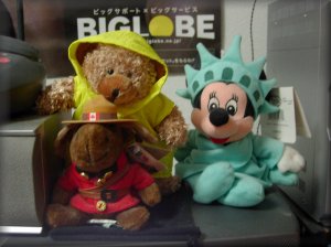 03年3月3日、1000年に1度のひなまつり。ま、そんなことどーでもいいんですけどね(MJ)。最近、パソコンの調子がすこぶる悪い。メール書いてる途中でエラー。すっごくストレスたまります。11gが標準搭載になったらノートPCを買おうと思うのですが、5月以降の話ですね。それより、いまとってもショックなのが買おう買おうと思っていたカシオのデジカメですが、某雑誌で評価が非常に悪かった。読まなかった方がよかったかも。購買意欲が薄れました。同じレンズを利用しているペンタックスの評価を見てからにしようと思ったところにサンヨーの新機種が。サンヨーのデジカメももう少し軽かったらなー。で、いろいろ僕のデジカメ使う用途を考えたのですが、海外旅行のこのHPの写真だけですね。別に画素数は多くなくてもいいよーな。てなわけで、今回の写真は海外で買ったぬいぐるみ達。以前に出演してますね。初登場の黄色いベアちゃんは前にカナダ行った時に欲しいなーって思ってたのですが買なかった話をカナダの友達にしたところ、送っていただいたものです。依頼して2年後くらいに(笑)。あー、海外行きたい。てなわけで隣のネズミが着ているところへ行く計画たてました。('03/03)。