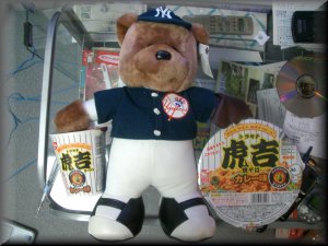ニューヨークから無事に帰ることができました。でも、なんか咳き込んでます。もしかしてSARS?そういえば、行きの飛行機で咳き込んでるアジア人がたくさんいたし、帰りの飛行機は成田経由の香港行きなんていうとってもデンジャラスな便だったんですよね。ノースウエストってアメリカの飛行機のはずでしょ。乗ってるのがほとんどアジア人だったからね。僕らも含めて。そりゃSARSにもかかるわ。そんでもってよくよく考えてみたら、メジャーリーグの相手チームってトロントブルージェルズですよ。トロントといえば、再度SARSが広がる可能性ができたところですよ。トロントはニューヨークと隣り合わせですからね、当然、応援しに人が着てることでしょう。あの多くの入場者の中にSARS患者がいないとも限らない。ていうか、SARSっていったいなんだんだよ。いいかげんにしろよSARS!正体あたわして抗菌剤さっさと作れってーの。てなわけで、メジャーリーグで買ってきたニューヨークヤンキース熊ちゃんです。前回同様、お土産にかこまれております。この熊ちゃん、同期の送別会であげちゃいましたので、今は家におりません。てなわけで、エッセイでも書きましたが、今年中にもう一回ニューヨークに行って、熊ちゃんを買ってきますよ。はい('03/06)。