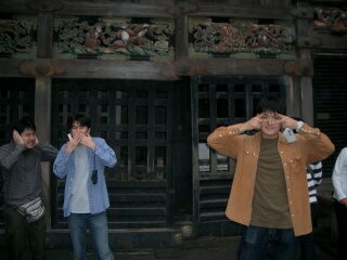 朝食が何時か判らないけど、とりあえず早く出発 ということは決まっていたので、6時半に起床してみる。 当然といえば当然だが2人とも寝ている。 朝食は8時ということが分かったか、 2人とも起きる気配なし。186くんは起きるが 「あと何分寝られますか?」という回答。 110くんに至ってはピクリとも動かず綺麗な姿勢で 寝続ける。そして8時を過ぎても二人とも起きない。 今日はメインエベントの東照宮です。見猿、言わ猿、 着飾るです。着飾ってどないすんねん。 はい、すべったところで、9時半スタートはやっぱり 遅すぎです。東照宮前で恐ろしい渋滞になってます。 本日のサブエベント「華厳の滝」へ先に行くことに決定。 |