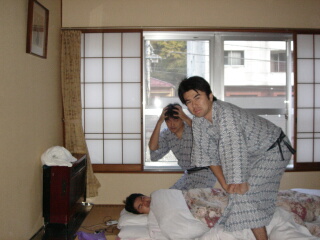 旅館の食事はなかなか美味かったです。 特にメロンが美味い。食後は駅まで散歩をしたのですが、 何もありません。ホント何もありません。 射撃もストリップ劇場もありません。 駅の近くの藤野というカフェでホットカフェオレを 飲みました。門限間際に旅館に戻って、 エンタとオンエアバトル見て消灯です。 朝7時半に起きて旅館の朝食です。 いつもなら110くんも186くんもダラダラ起きるのに、 珍しくきちんと朝飯です。 昨日は大浴場ってことでイマイチでしたが、 女湯と男湯が入れ替わり、朝は岩風呂に入れます。 期待大。中に入ってボーゼン。 露天風呂かと思いきや、内風呂の壁に 岩が張ってあるだけで、浴槽もタイル。。。 なんじゃそりゃ。 | |