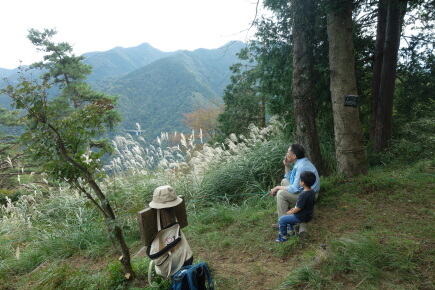 「山頂でタバコをすうおじいちゃんと孫とススキ」。哀愁がただよって、絵になりますね(笑)。