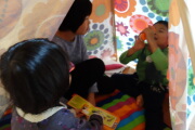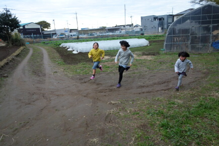 インドアで遊んでいた子供たちは、お腹がいっぱいになったら、外で遊びます。色鬼、土管綱渡り、かけっこ。