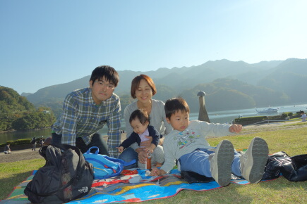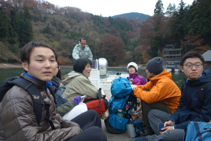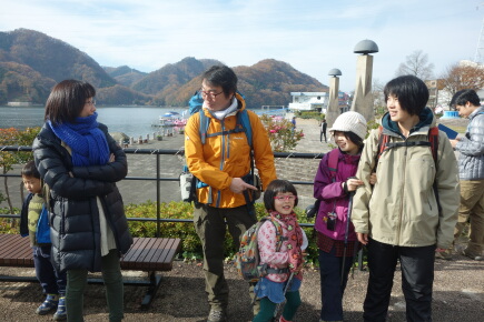 相模湖の渡し舟で相模湖公園に戻る企画です。岳は木曜日から胃腸炎になり、土曜日のお遊戯発表会も
