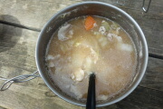 精進とん汁です。ちゃんと豚肉は入っておりますが、100円以内に収めたので、具が少なめです。