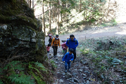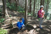 今回はファミリー向けの楽々コースで、しかも同じ道を往復です。スーさんが木を削って杖を作ります。