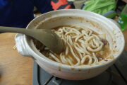 食事の前にぽっとん便所で悪戦苦闘する鈴木家なのでした(笑)。味噌がとってもおいしい猪鍋です。