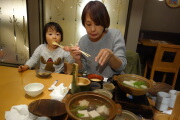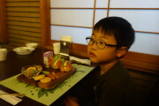 夕飯はついてないので、嵯峨とうふ稲本店で湯豆腐を食べました。岳は九条ネギがお気に入りになりました。