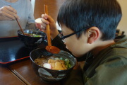 岳はキツネ蕎麦を食べました。嫁さんと美幸はニシンうどんです。とっても美味しくいただきました。