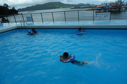 食べてから、無事に鳥羽に到着。宿のプールにも無事に入れました。温泉に入って、