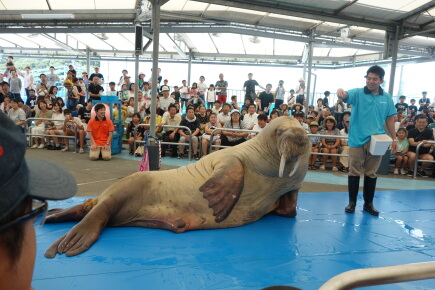 ローカル電車を20分待ちます。鳥羽水族館に到着です。さっそく、11時のセイウチショーを