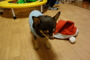 お祝いしました。マロンもサンタの帽子をかぶってクリスマスケーキを食べました。