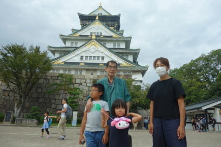 大阪城に行く前にランニングしている人に撮ってもらいました。じいじ、またきてください。