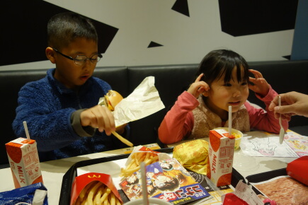 やはり、子供は魚よりマックですね。大阪ではマクド。ニジマスも大漁にコーンを