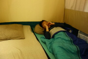 息子と二人でテント泊します。ママと娘は優雅にベッド泊です。。。