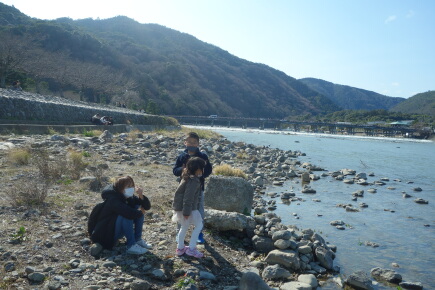 下山後は渡月橋の川で石投げです。