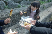 山頂のお猿さんに餌をあげます。