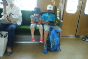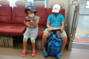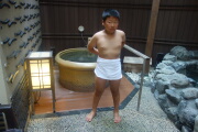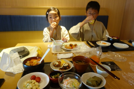 今日もママさんパートです。3人で朝風呂に入ります。朝は乳酸飲料が飲み放題です。その後、ホテルの