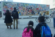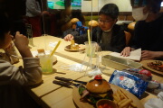 娘は公文の宿題を済ませます。午後はうめきた広場のコンテナに描かれたワンピースを