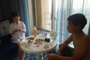 無事、マリオに会えました。朝食バイキングを食べてたら、早く着いたママから既に