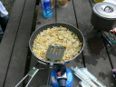 お昼は冷凍チャーハン、冷凍お好み焼き。持参のカップめん。夕べの鳴海さんの