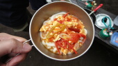 駆使しながら説明します(笑)。トマトと玉子で作ります。謎の調味料を入れて完成です。スープはとっても