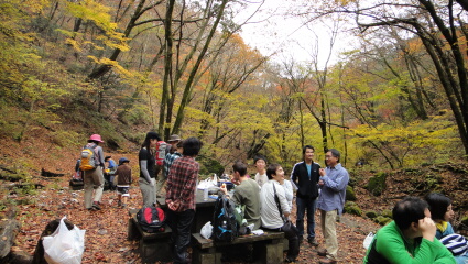 七代の滝に行く前に、いつもの見晴台で集合写真。本日は半袖でもOKの夏のような日でした。