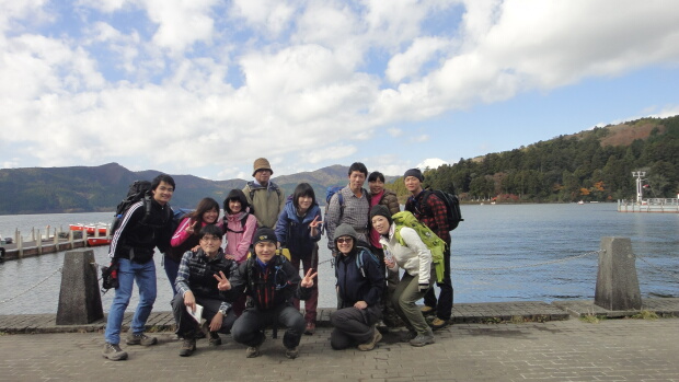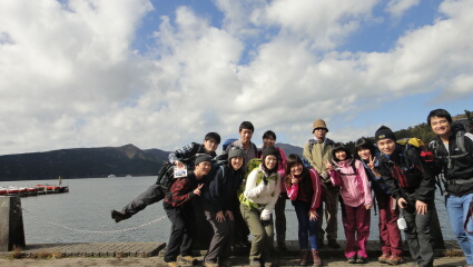 芦ノ湖は富士山が雲で隠れておりました。集合写真を撮ってから富士山の雲が無くなってきました。