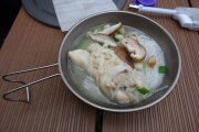 本日の山ごはんは「サング汁のつけビーフン」。つまり、名前の無い料理です。フライドポテト付き。